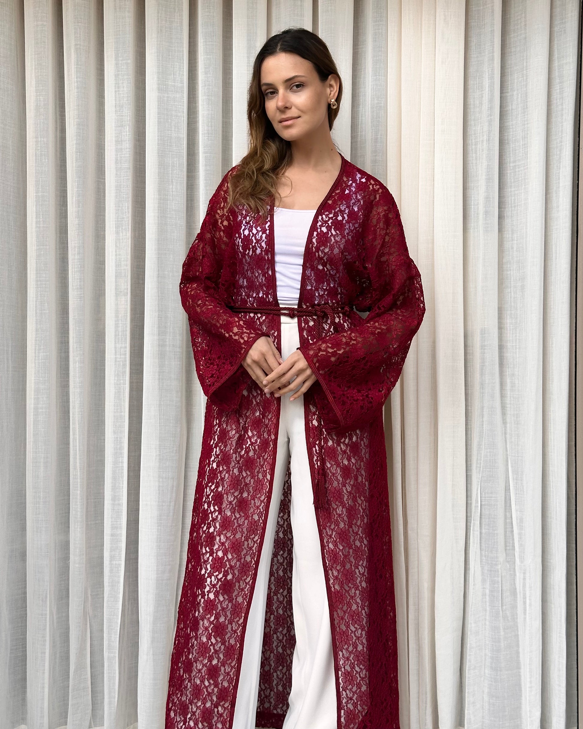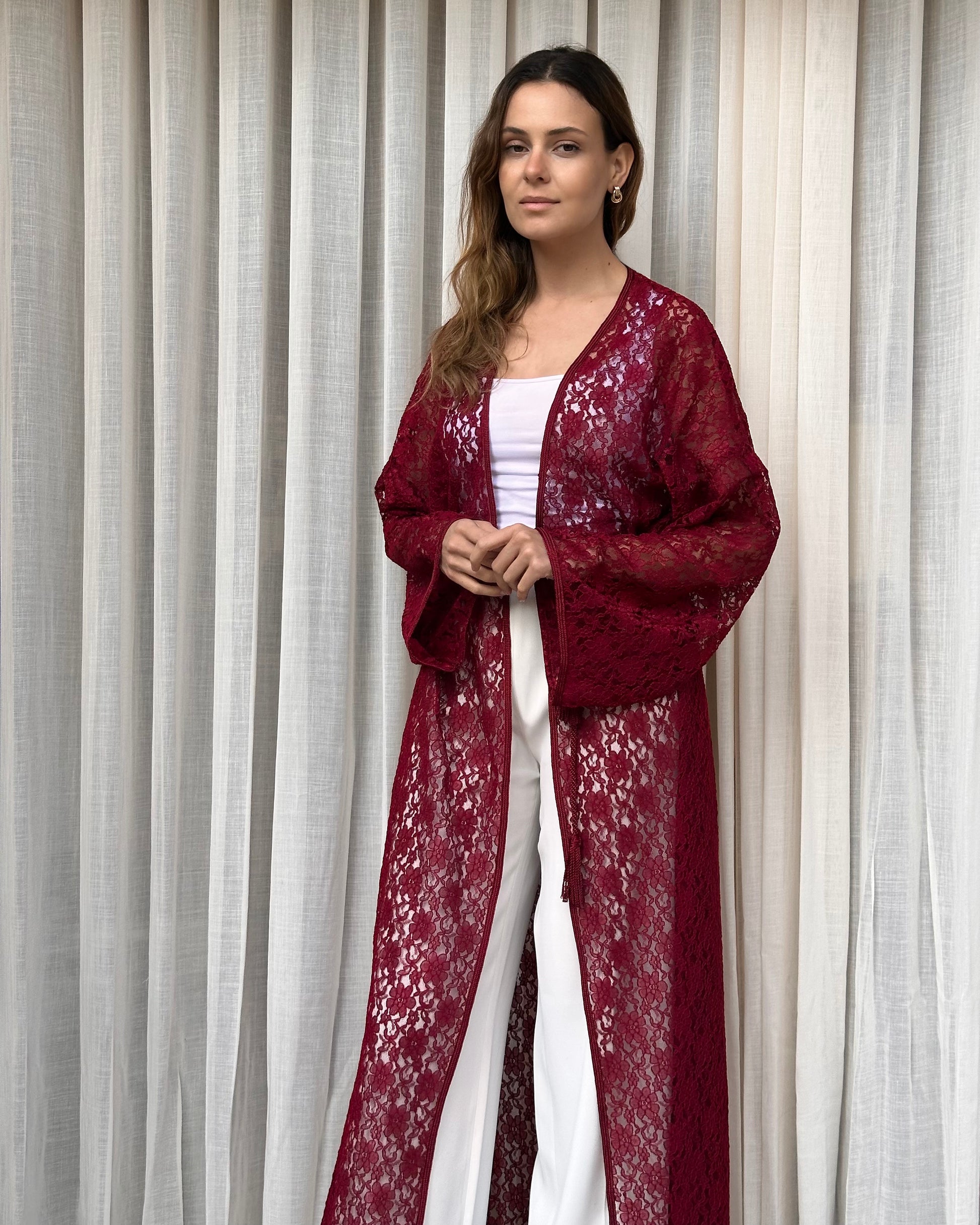 Kimono en dentelle bordeaux, orné d’une sfifa ton sur ton et d’un mejdoul assorti. Fentes latérales pour compléter votre allure.